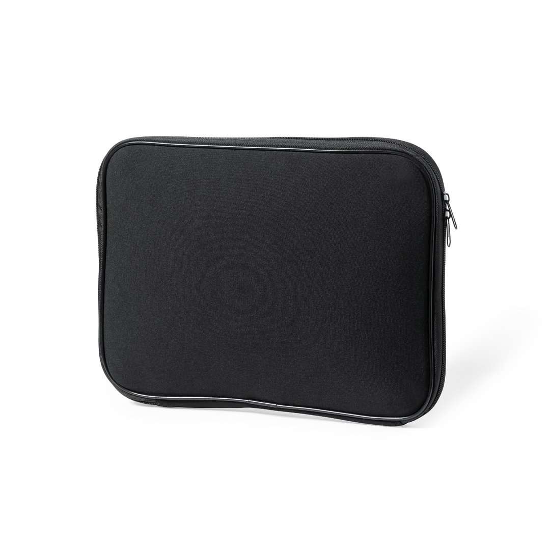 Custodia per laptop, realizzata in resistente soft shell. In un elegante colore nero con interno imbottito. Chiusura a zip con doppio tirante. Adatto a laptop o tablet fino a 15".