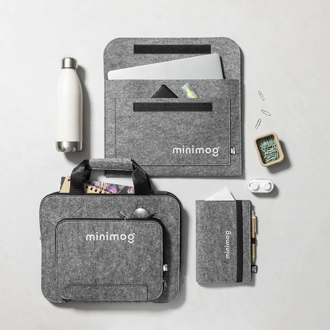 Custodia per computer portatile della linea natura e in resistente feltro riciclato RPET, il risultato della combinazione del processo di riciclaggio delle materie plastiche insieme alla tecnica millenaria di fabbricazione del feltro, ottenendo un materiale eco-trend che, oltre ad essere di origine riciclata, diventa anche riciclabile. Patta con chiusure in velcro e tasca frontale, con badge RPET sull'etichetta esterna.
