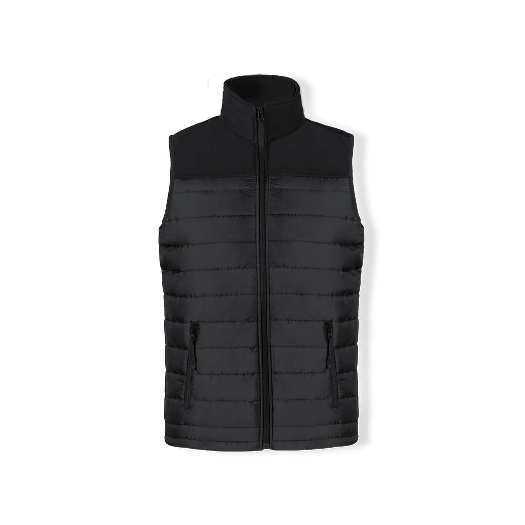 Gilet impermeabile e traspirante in una combinazione di materiali soft shell e poliestere. Elegante struttura nera con chiusura a zip e tasche laterali con zip con tiretti per una facile apertura. Disponibile nelle taglie S, M, L, XL, XXL.