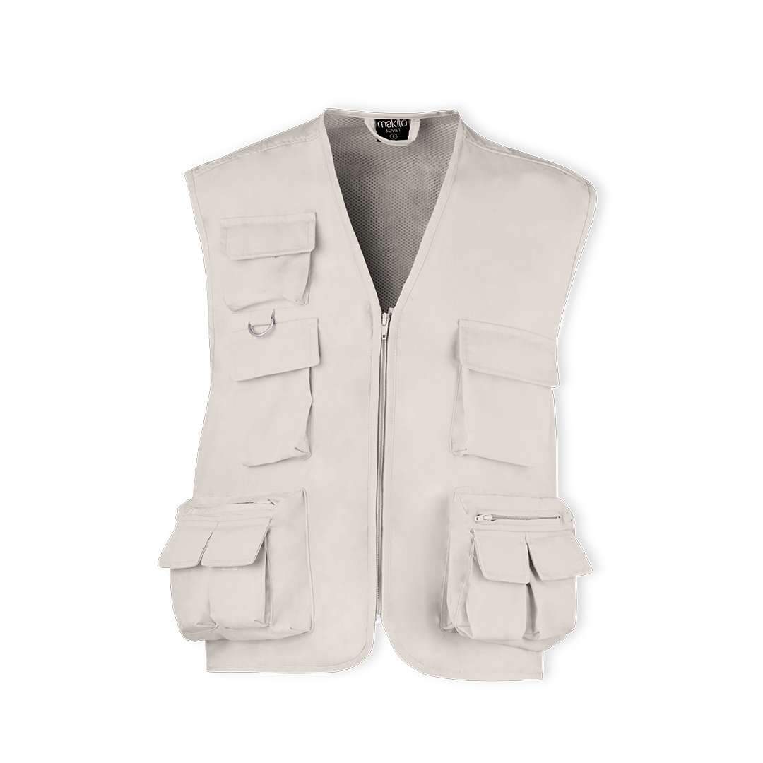 Gilet in una resistente combinazione di cotone e poliestere in colori vivaci. Chiusura principale con zip, numerose tasche frontali e laterali di grande capacità con chiusura in velcro e anello metallico sul petto. Disponibile nelle taglie L, XL, XXL.