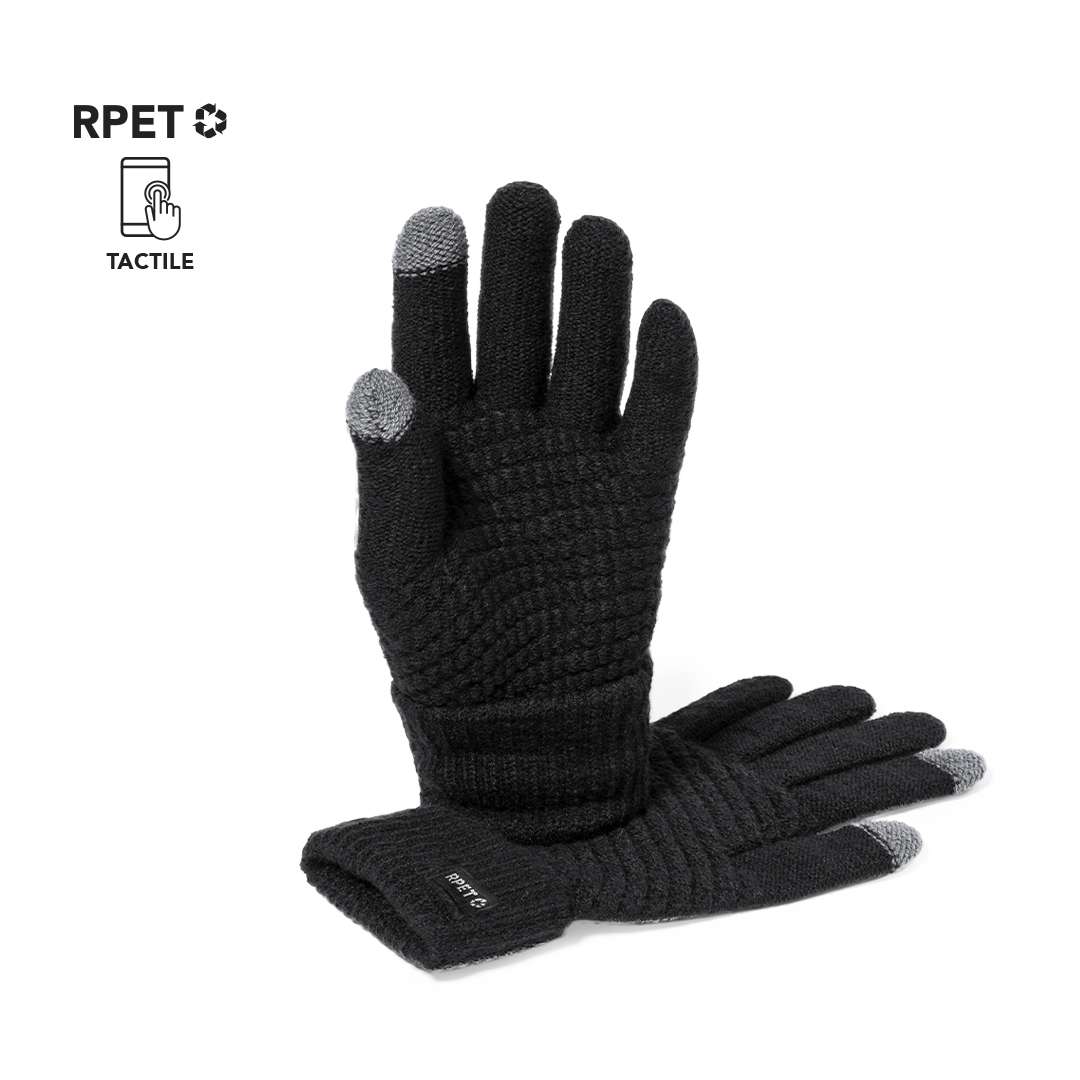 Pratico paio di guanti per dispositivi touch screen. Realizzati in calda e morbida finitura in poliestere RPET. Funzione touch su indice e pollice. Taglia unica per adulti, con logo RPET sull'etichetta esterna.Il materiale RPET è realizzato con plastica riciclata, in modo da incentivare il riutilizzo dei rifiuti plastici e aiutare la sostenibilità del pianeta.