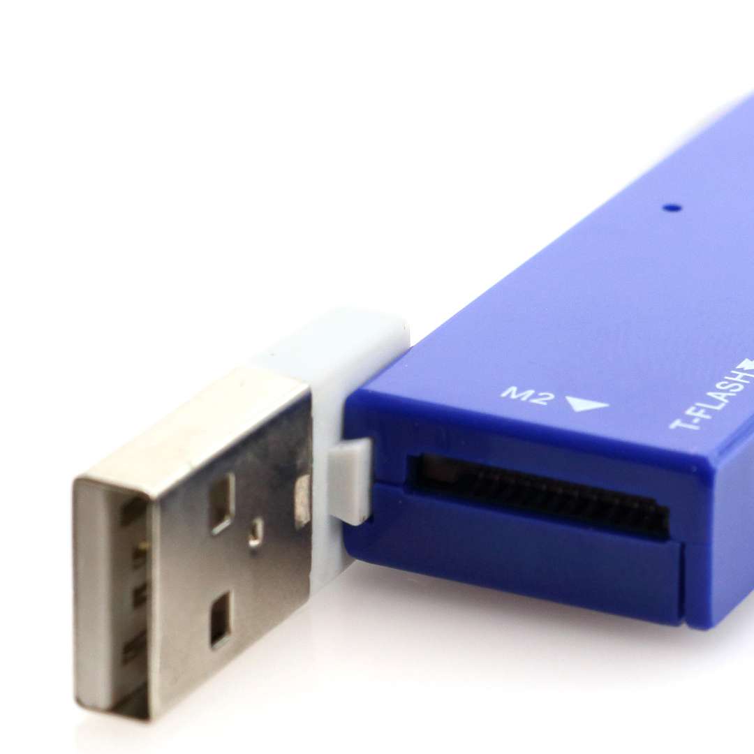 Lettore di schede completo di connessione USB 2.0. Design quadrato, disponibile in vari colori e compatibile con quasi tutti i formati di schede di memoria presenti sul mercato: M2, MS Duo, MS Pro Duo, MS, MS Pro, MicroSD, MiniSD, RSmmC, SD, mmC. Confezionato singolarmente.