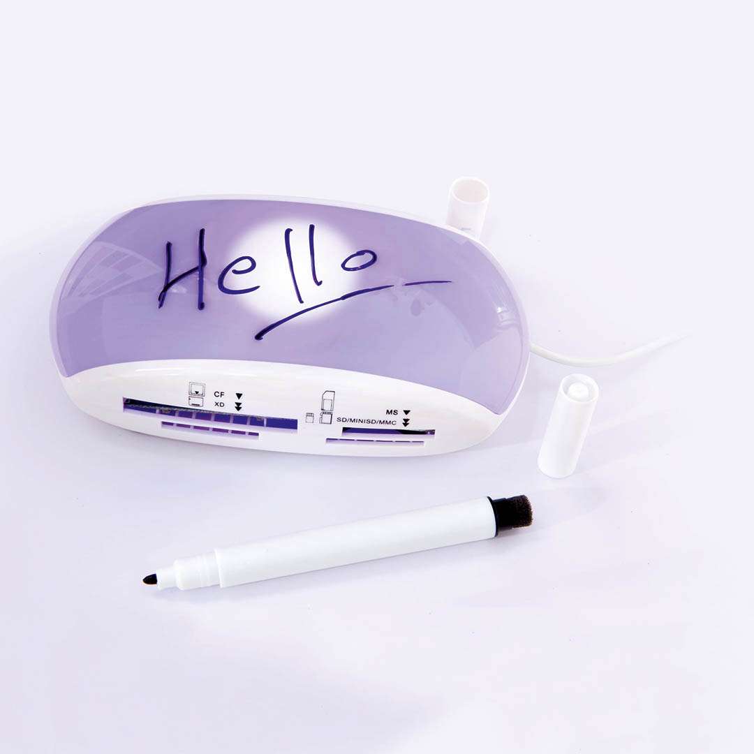 Lettore di schede originale dal design ricurvo bicolore e copertura superiore semitrasparente retroilluminata. Con pennarello per scrivere messaggi sul lato retroilluminato e compatibile con schede SD, MiniSD, mmC, XD, XS, CF. Presentato in una scatola nera individuale.