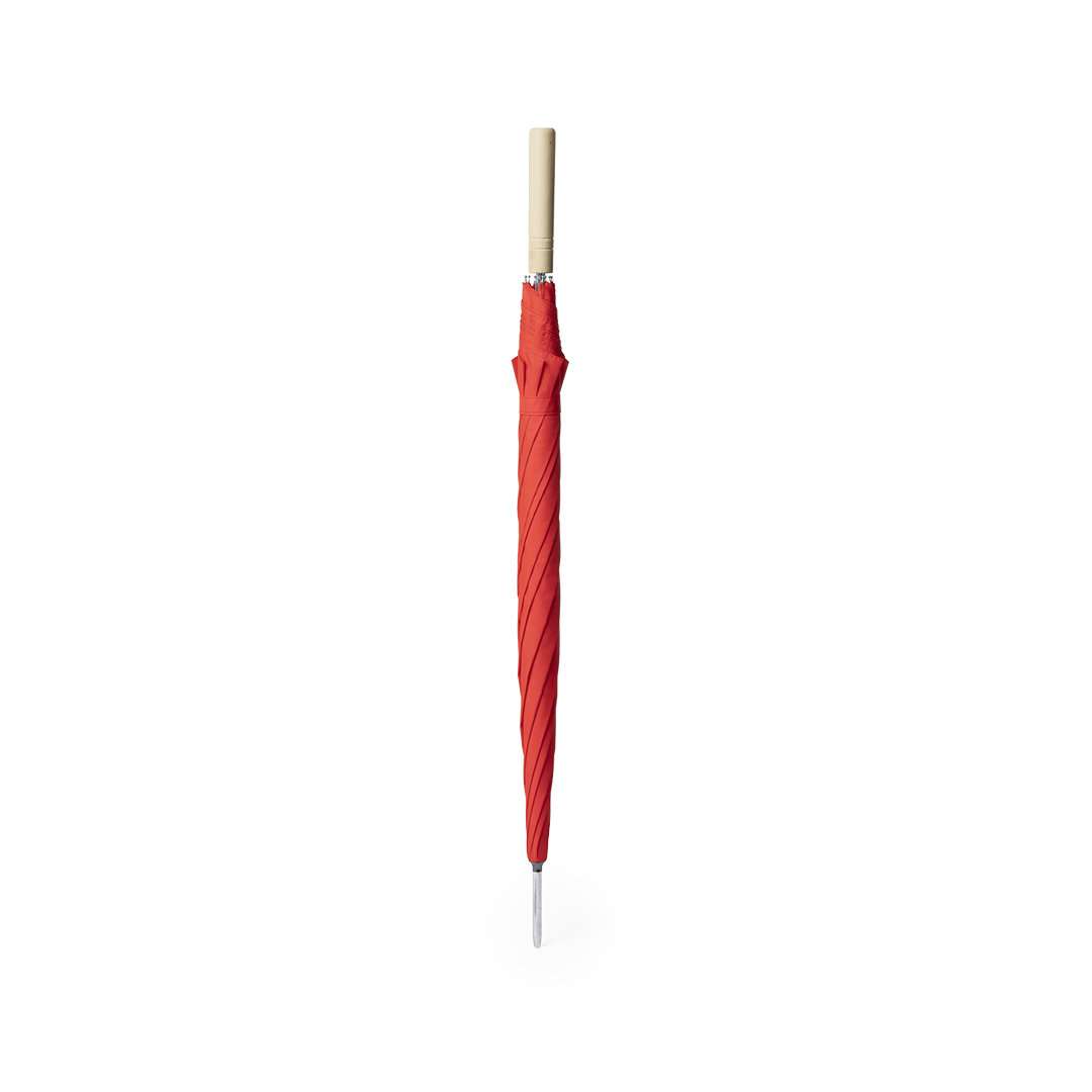 Ombrello con 8 pannelli in nylon 190T, 105 cm di diametro. Apertura automatica, con aste metalliche di colore cromato e manico in legno. Disponibile in una vasta gamma di colori piatti o combinazioni con il bianco.