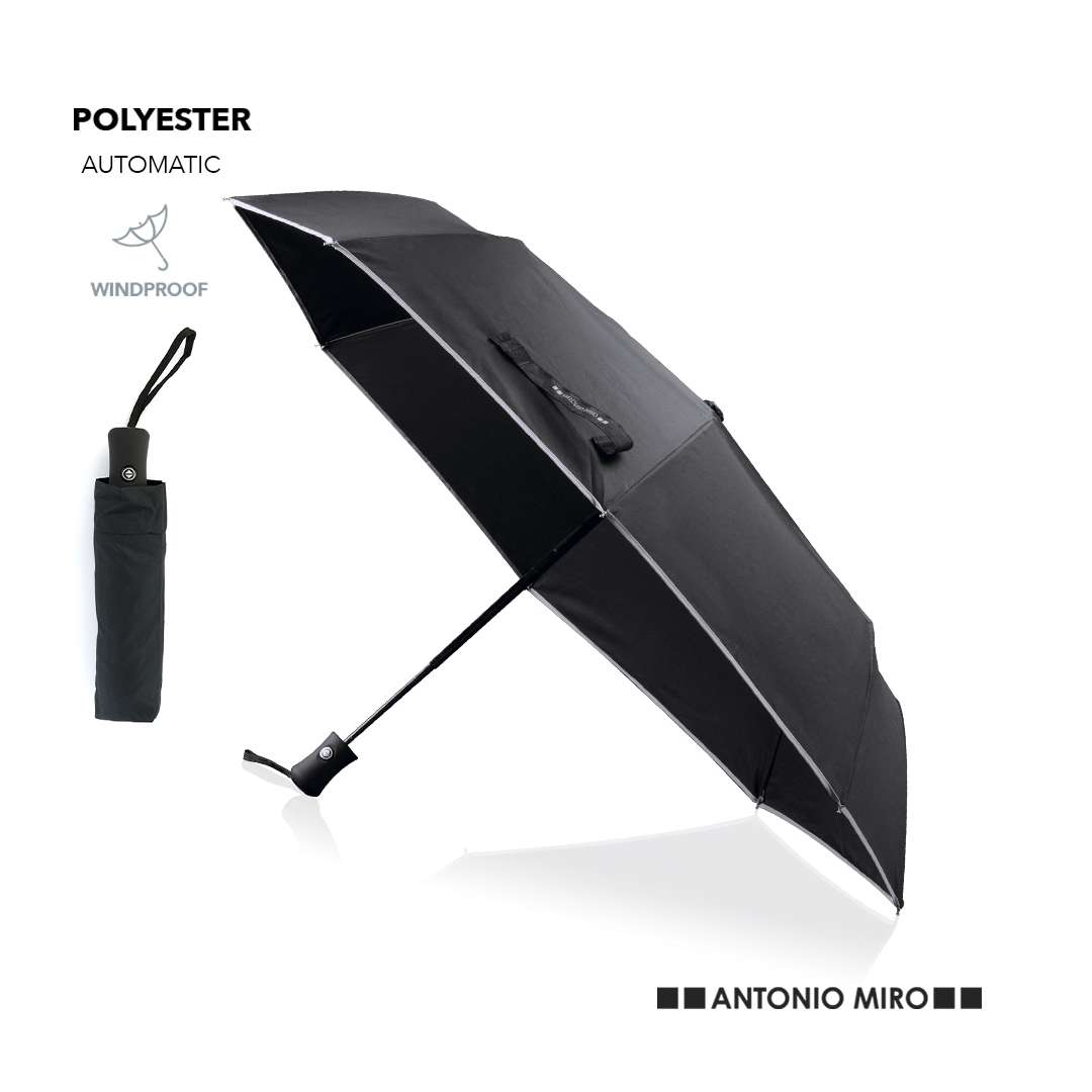 Ombrello pieghevole by Antonio Miró, con 8 pannelli e design elegante in nero con finiture bianche. Diametro di 95 cm, con meccanismo di apertura e chiusura automatica, sistema antivento e materiale in pongee resistente. Con aste in metallo nero, chiusura in velcro e manico ergonomico con tracolla. Presentato in una custodia individuale coordinata con il logo del marchio.