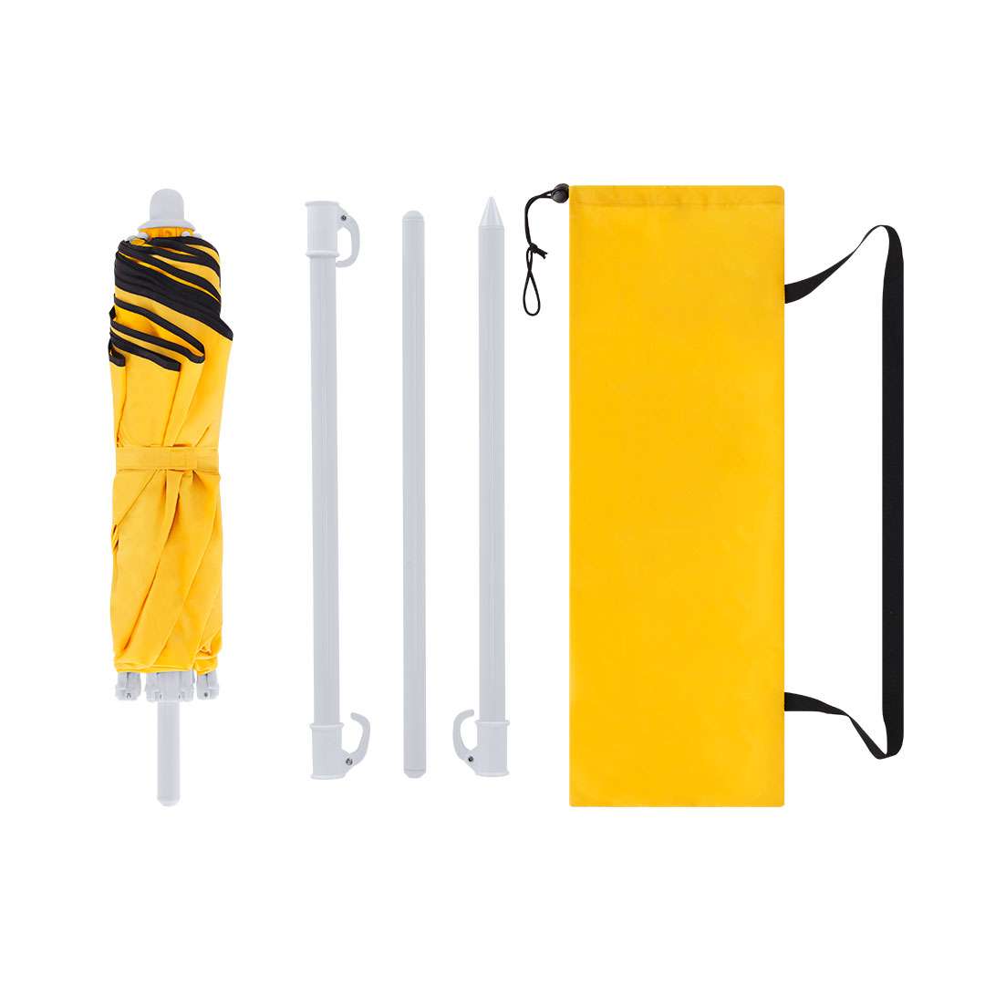 Ombrellone da spiaggia pieghevole a 8 pannelli, il suo design compatto in quattro sezioni facilita il montaggio. Realizzato in nylon resistente con interno di colore grigio argento e protezione UV, con un diametro di 160 cm, altezza regolabile e tubi metalizzati di colore bianco. Le stecche sono fabbricate in fibra di vetro per maggiore resistenza e resistente al vento. Viene presentato in una pratica custodia trasparente abbinata all'ombrello, con chiusura a corda e nastro per il trasporto.