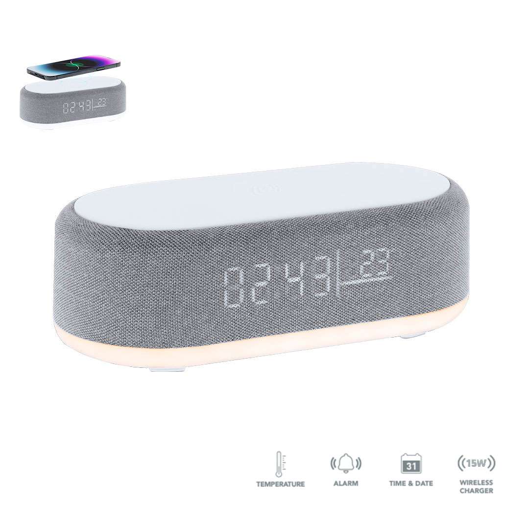 Orologio multifunzione 5 in 1. Include molteplici funzioni:- Caricatore wireless da 15W- Lampada con luce calda e intensità regolabile, ideale per creare atmosfere piacevoli- Altoparlante da 5W- Funzione ora (12/24h) e sveglia- Indicatore di temperatura e data. Con schermo retroilluminato e batteria da 1200 mAh. Compatibile con dispositivi dotati di tecnologia di ricarica wireless Qi. Realizzato in ABS bianco in combinazione con poliestere. Con ingresso USB Tipo C -cavo incluso -.