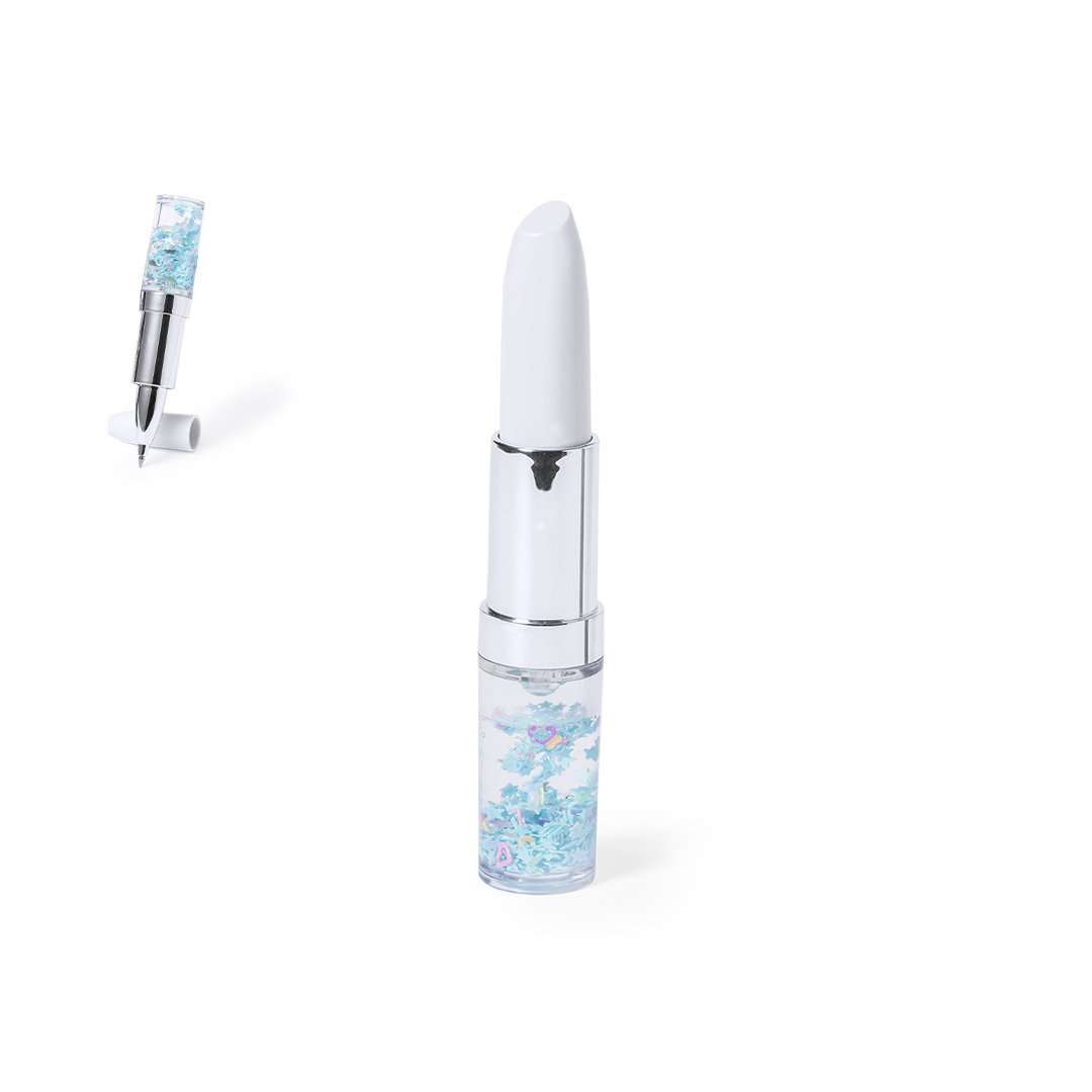 Originale penna a forma di rossetto, con liquido all'interno con un design colorato. Con cappuccio e inchiostro blu.