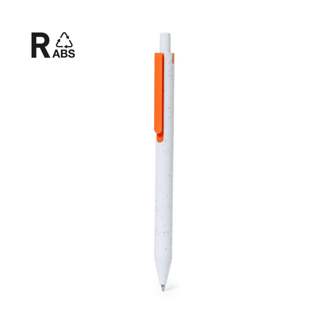 Penna con meccanismo a pulsante, realizzata in ABS riciclato. Con clip dai colori vivaci e fusto liscio bianco pieno. Etichetta ABS riciclato sulla parte superiore della penna. In inchiostro blu.