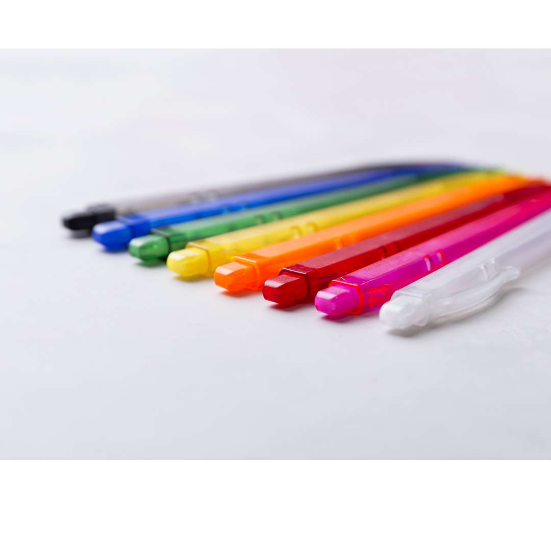 Originale penna con fusto rettangolare in finitura semitrasparente tinta unita. Con meccanismo a pulsante, clip originale e disponibile in un'ampia gamma di colori. Inchiostro blu.