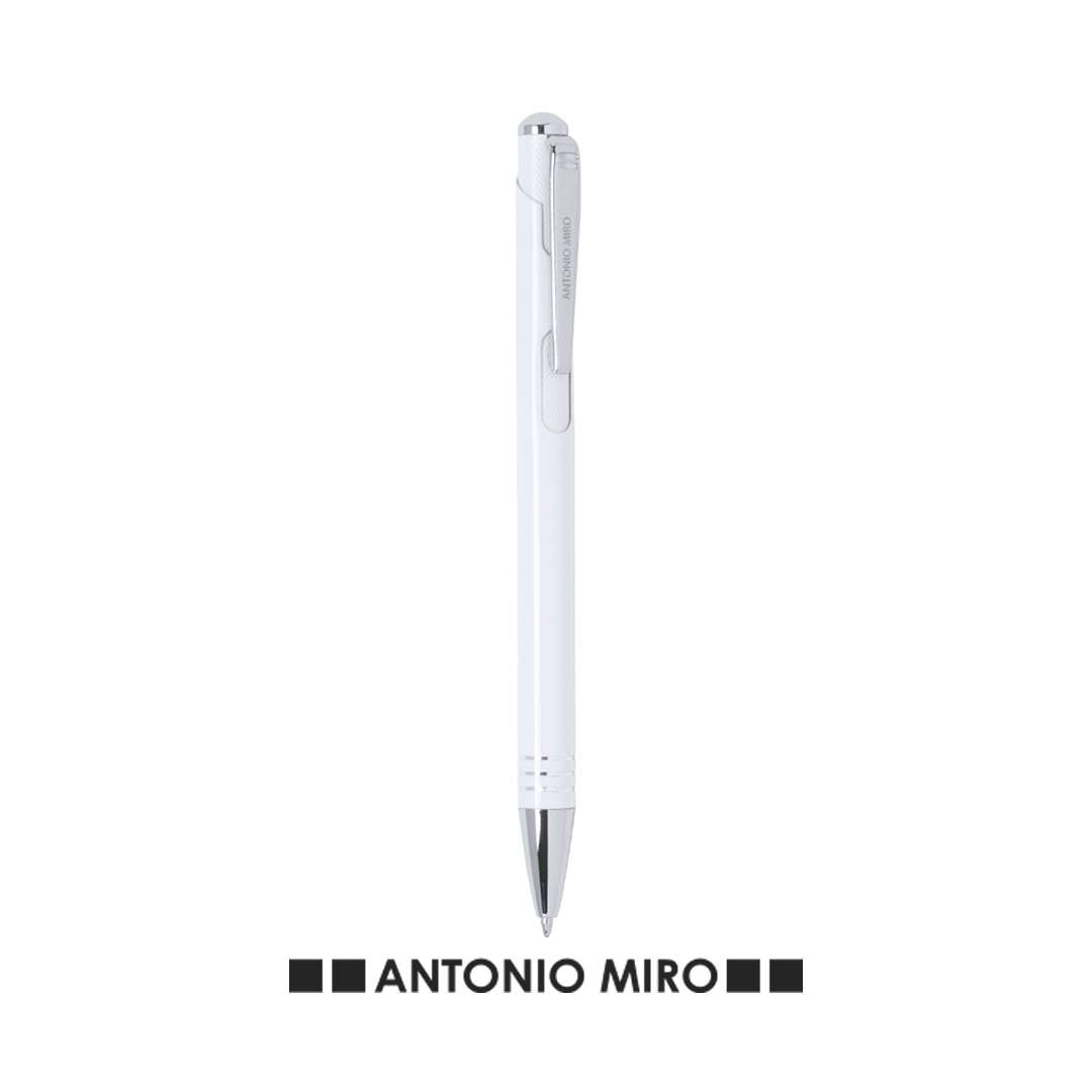 Penna by Antonio Miró dall'elegante design e dal fusto in alluminio liscio con dettagli color argento. Meccanismo a pulsante, con parte superiore e motiv onel fusto in trama di carbonio. Originale clip in metallo e presentata in una custodia individuale in alluminio nero con logo del marchio. Inchiostro blu.