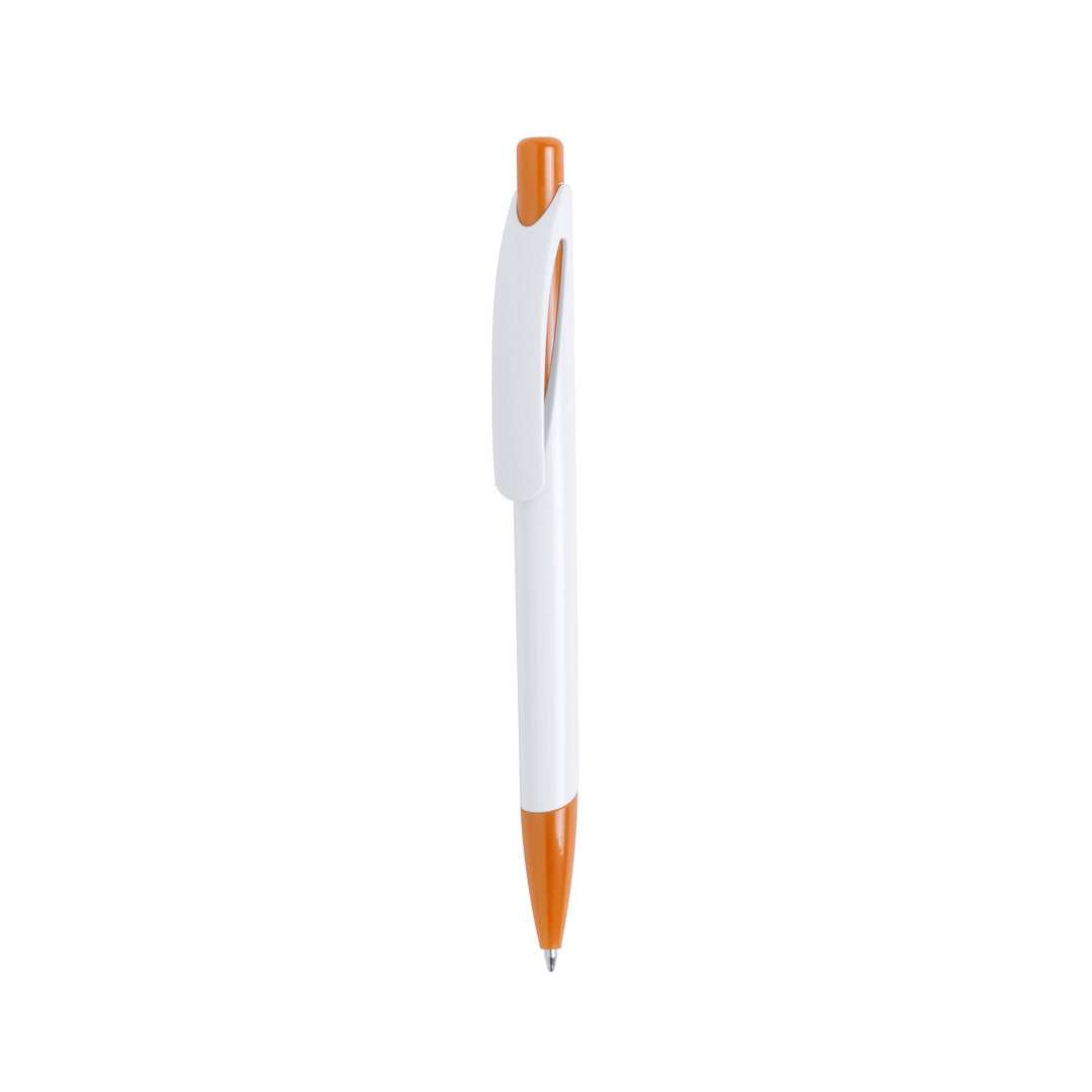 Penna a pulsante bicolore con elementi in tinta unita e fusto bianco liscio. Con originale clip curva e punta coordinata. Inchiostro blu