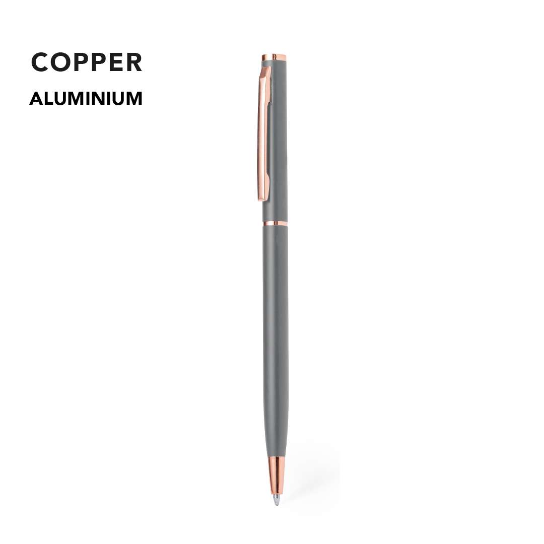 Eccezionale penna in alluminio con meccanismo a rotazione. Robusto fusto in alluminio opaco con elementi decorativi in elegante finitura color rame, con fusto in un'ampia gamma di colori esclusivi. Clip in metallo e inchiostro blu. Presentate in un astuccio individuale riciclato.