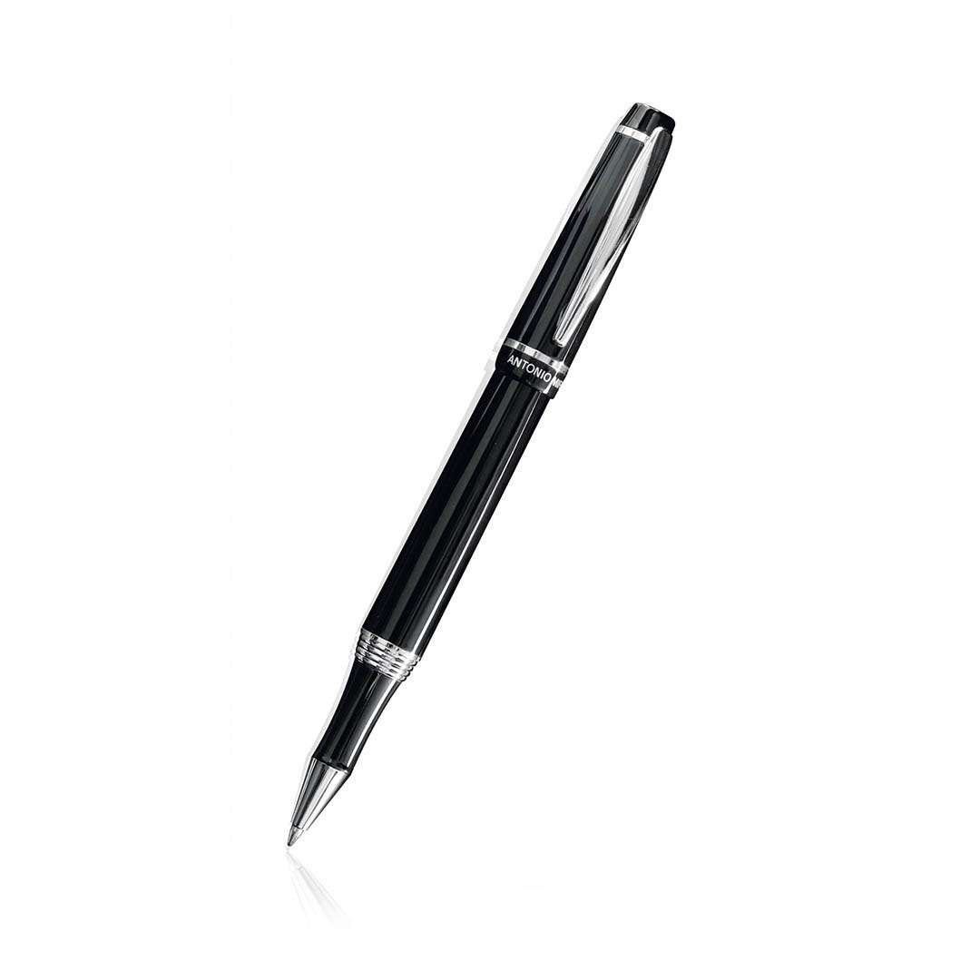 Penna roller by Antonio Miró con cappuccio dall'elegante design bicolore e fusto metallico liscio in sobrio nero. Con logo del marchio sotto l'anello, clip e punta in finitura argento lucido. Presentata in un astuccio nero individuale con logo del marchio. In inchiostro blu.