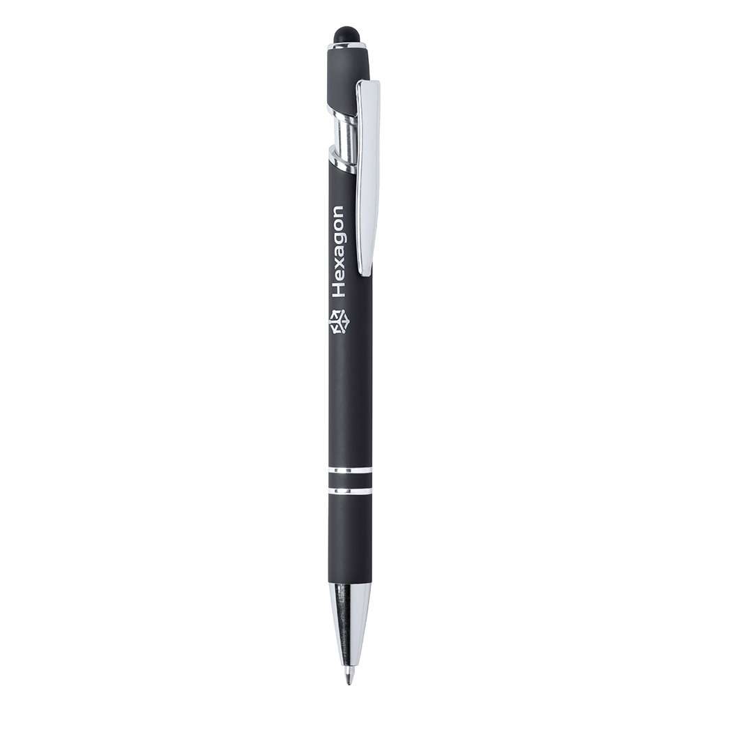 Penna a sfera dal design originale. Corpo in alluminio con finitura in gomma, appositamente progettato per la marcatura laser e la visualizzazione del logo in tono argento. Con accessori cromati e clip in metallo. Disponibile in una vasta gamma di colori, con cartuccia jumbo e inchiostro blu.