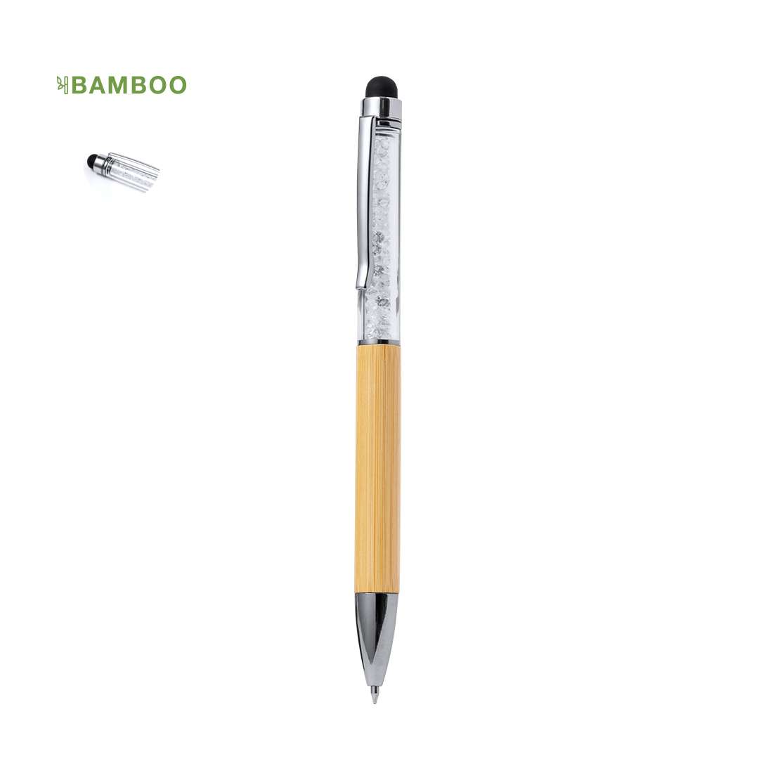 Elegante penna touch in bambù. Struttura in bambù con capsula trasparente che ospita cristalli a forma di diamante. Questa elegante penna è dotata di pennino touch sulla parte superiore, una clip ed elementi decorativi in metallo. Con meccanismo a rotazione e inchiostro blu. Materiali come il bambù favoriscono l'utilizzo di materie prime naturali, riducendo le emissioni inquinanti. Proviene da una pianta altamente resistente e versatile, con una rapida crescita e rigenerazione, che lo rende un'ottima alternativa all'uso del legno tradizionale.