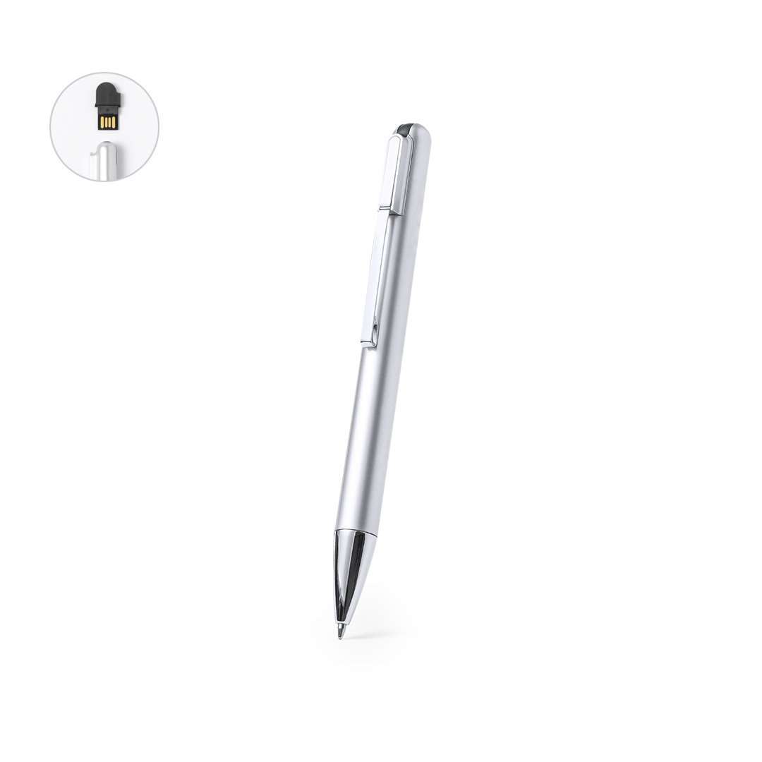 Penna USB in ABS resistente con finitura metallica lucida. Con chiavetta USB da 16 GB integrata nella parte superiore e clip in metallo. Meccanismo a rotazione, cartuccia jumbo e inchiostro blu. Confezionata singolarmente in una scatola nera.