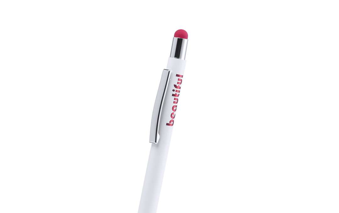 Penna touch in gomma appositamente progettata per la stampa laser con logo rosa. Meccanismo a pulsante, con clip in metallo e dettagli ramati. Fusto disponibile in 4 colori diversi, cartuccia jumbo e inchiostro blu.Presentata in un'elegante scatola nera di design