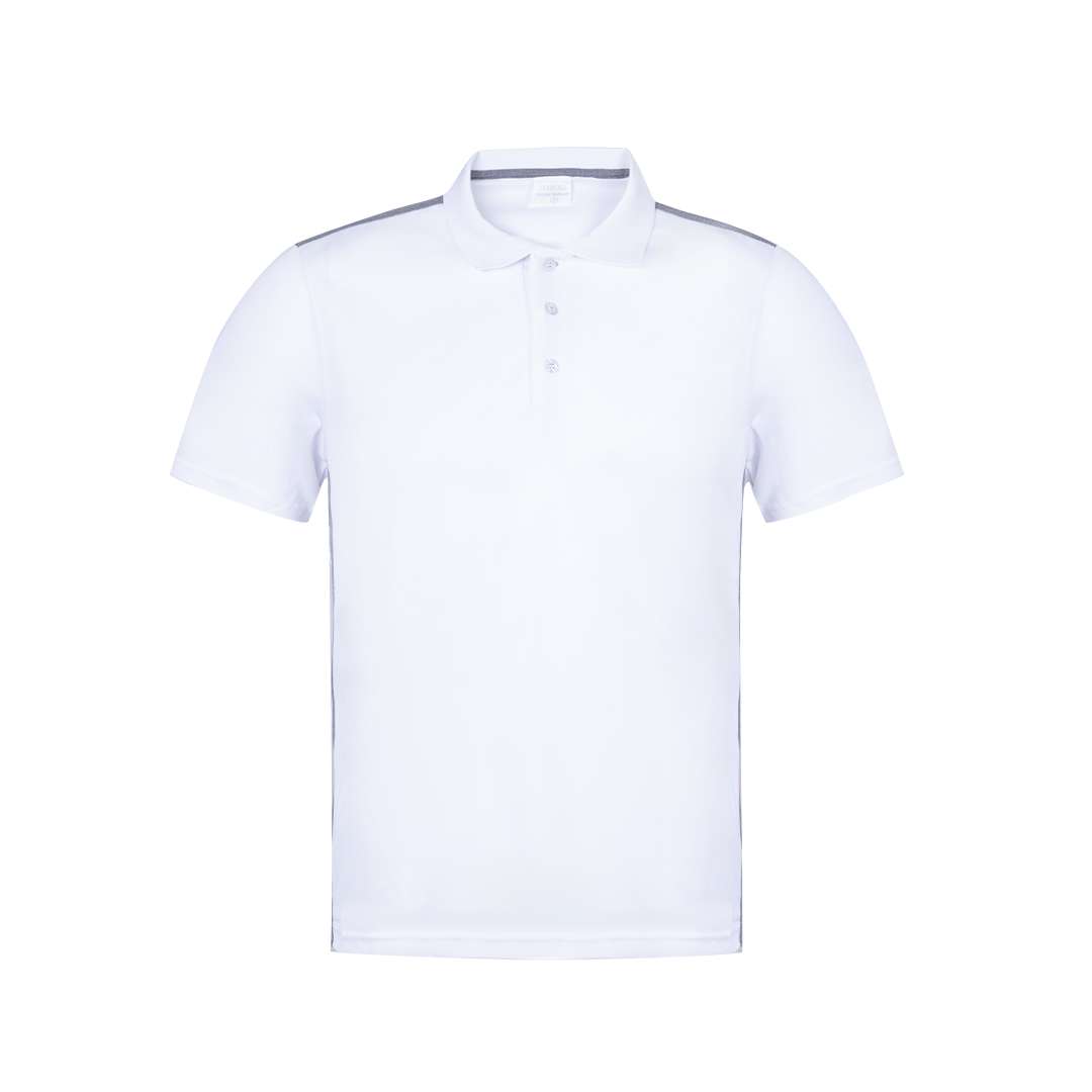 Polo tecnica per adulti in poliestere traspirante 180g / m2. Elegante design bicolore, bianco con dettagli grigi a contrasto. Disponibile nelle taglie S, M, L, XL, XXL. Colore bianco appositamente realizzato per la marcatura a sublimazione.