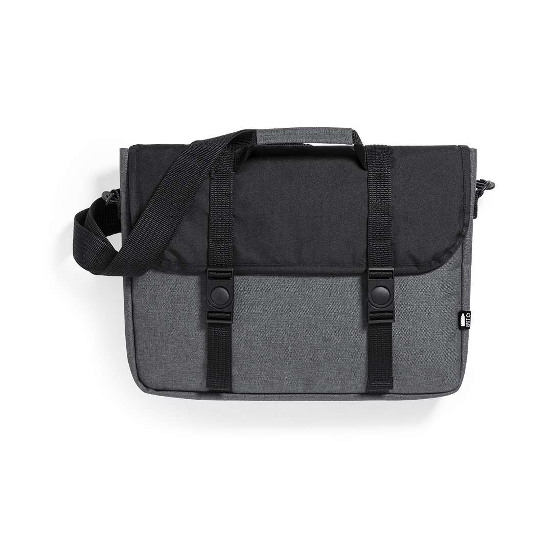 Portadocumenti della linea natura, in resistente poliestere 600D RPET riciclato e senza PVC, risultato dalla combinazione del processo di riciclaggio delle materie plastiche insieme alla tecnica millenaria di fabbricazione del feltro, ottenendo un materiale eco-trend di origine riciclata.Tasca principale imbottita e cinghie di chiusura a fibbia tasca interna con zip e tracolla regolabile. Con maniglia di trasporto rinforzata e attacco trolley bar sul retro. Resistenza fino a 7 kg, con distintivo RPET sull'etichetta esterna.