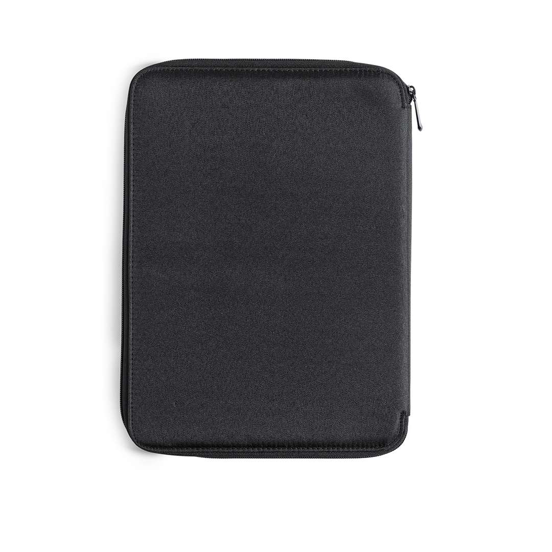 Elegante portadocumenti con chiusura a zip in morbida microfibra. Interno con blocco removibile da 20 fogli a riga, tasca con cerniera, tasca con patta, portacarte e portapenne. Con elegante targhetta metallica sul fronte per la stampa laser.
