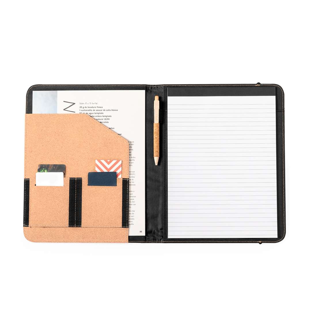 Elegante cartellina in sughero naturale. Con un'ampia tasca interna per i documenti, 4 portacarte, passante elastico per penna e blocco da 20 fogli con layout a righe singole. Si chiude con un elastico esterno. Confezionato singolarmente in un sacchetto riciclato. Realizzata con elementi di origine vegetale per promuovere l'uso di materie prime naturali e ridurre le emissioni inquinanti.
