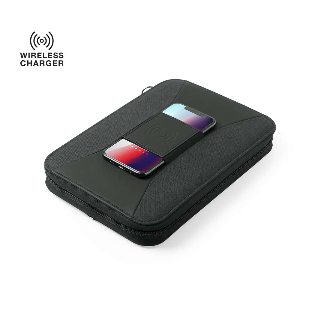 Portaoggetti completo per power bank, in una combinazione di materiali in poliestere 300D e PU. Caricatore wireless integrato nel coperchio, con supporto per smartphone. Include una batteria ausiliaria da 4.000 mAh con capacità di ricarica integrata. Dal design sobrio e con chiusura a zip, include un block notes da 64 fogli con layout a righe singole, un portapenne e un portacarte. Uscita USB, con cavo micro USB incluso e presentato in un'elegante scatola nera. Le capacità indicate su tutti i nostri power bank sono reali; tutti incorporano batterie di grado A, non riciclate, con una durata di almeno 500 cicli di carica e conformi alla normativa CE. Inoltre, sono prodotti secondo gli standard RoHS e in conformità con i seguenti requisiti di sicurezza: Sistema di protezione da sovraccarico del power bank. Sistema di protezione dalla scarica completa per una maggiore durata del power bank. Sistema di blocco per prevenire i cortocircuiti.