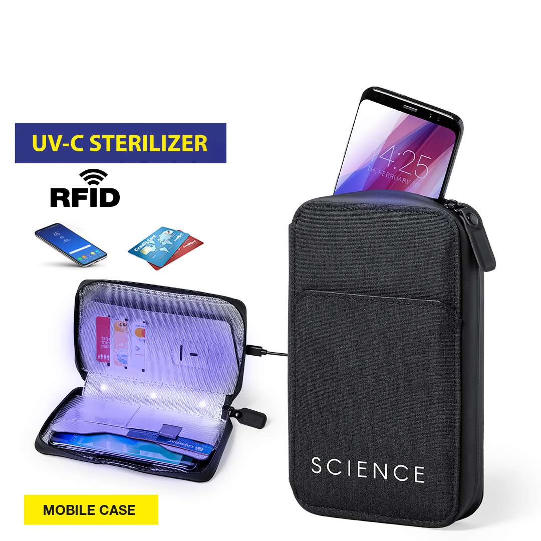 Organizer e sterilizzatore a luce ultravioletta tipo C, con protezione RFID (Radio Frequency Identification) che mantiene al sicuro i tuoi dispositivi di trasmissione dell'identità. Appositamente progettato per l'eliminazione di microrganismi e batteri negli smartphone e altri oggetti di uso quotidiano. Realizzato in resistente Poliestere 600D con finitura denim, con chiusura magnetica di sicurezza sul manico per un utilizzo sicuro del dispositivo. Include 4 porta carte interni + tasca esterna. Presentato in una scatola dal design personalizzato.Potenza LED da 1,2 W e lunghezza d'onda di 275 nm.Tempo di sterilizzazione con funzione di autospegnimento di 1 e 3 minuti.Manuale utente disponibile in spagnolo e inglese.Disponibili certificazioni CE, RoHS e efficacia germicida.Per un corretto utilizzo del prodotto, evitare il contatto con la pelle e gli occhi.