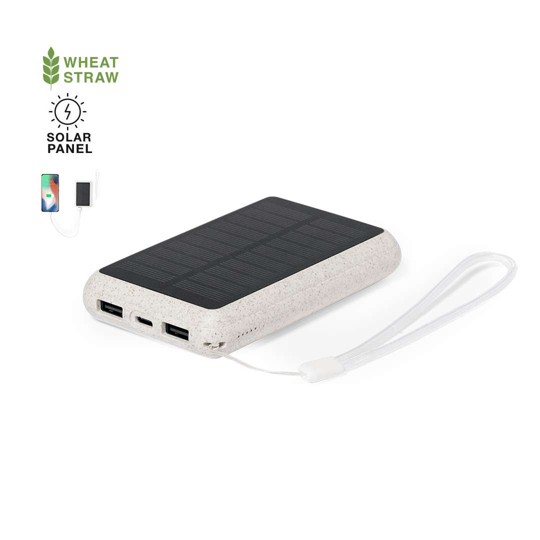 Power Bank ricaricabile in fibra di grano. Con capacità di carica di 5.000 mAh. Con connettore di ingresso/uscita di tipo C + uscite USB. Include un pannello fotovoltaico che consente di ricaricare la batteria in qualsiasi spazio esterno senza necessità di collegamento. Presentato in una scatola dal design kraft.Ingresso/uscita di tipo C: 5V DC 2,4A, 12W2 uscite USB: 5V DC 2.4A, 12WLe capacità indicate su tutte le nostre batterie ausiliarie esterne sono reali e comprendono tutte batterie di grado A e non riciclate, con una durata di almeno 500 cicli di carica e conformi alla normativa CE. Inoltre, sono prodotte secondo gli standard RoHS e in conformità ai seguenti requisiti di sicurezza:Sistema di protezione da sovraccarico del power bank.Sistema di protezione dalla scarica completa per una maggiore durata del power bank.Sistema di blocco per prevenire i cortocircuiti.Sistema di trasferimento costante della carica, in base alla capacità del dispositivo di destinazione.La fibra di grano promuove l'uso di materie prime naturali, riducendo così le emissioni inquinanti.