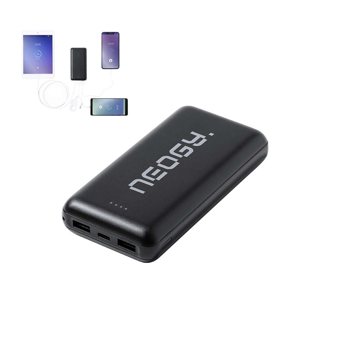 Power Bank ad alta capacità -20.000 mAh-. Connessione di tipo C per ingresso/uscita di corrente e doppia uscita USB. Con capacità di ricarica simultanea fino a 3 dispositivi. Indicatori di stato di carica e grande superficie di stampa. Confezionato in un'attraente scatola di design. Le capacità indicate su tutte le nostre batterie ausiliarie esterne sono reali, tutte con batterie di grado A e non riciclate, con una durata di almeno 500 cicli di carica e conformi alle normative CE. Inoltre, sono prodotte in conformità alle norme RoHS e in conformità con i seguenti requisiti di sicurezza: Sistema di protezione da sovraccarico del banco di alimentazione. Sistema di protezione a scarica completa che garantisce una maggiore durata del banco di potenza. Sistema di bloccaggio per prevenire i cortocircuiti. Sistema di trasferimento del carico costante, in funzione della capacità del dispositivo di destinazione.