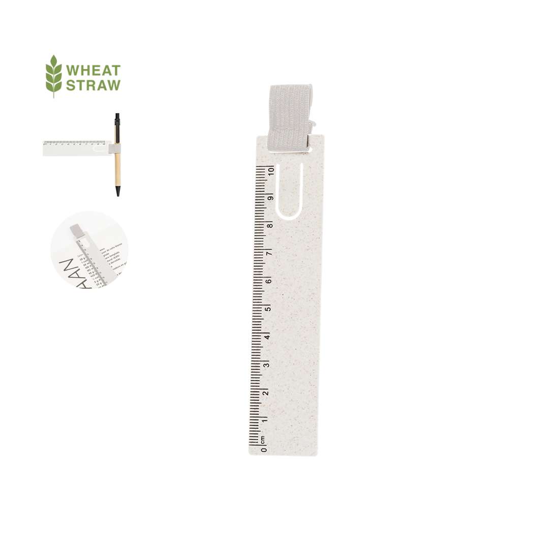 Originale righello segnalibro in fibra di grano. Pratico strumento di misura fino a 10 cm con una linguetta da usare come segnalibro e un elastico per tenere le penne. Realizzato in canna di grano e poliestere. Confezionato singolarmente in un sacchetto di carta riciclata. La fibra di grano favorisce l'uso di materie prime naturali, riducendo così le emissioni inquinanti.