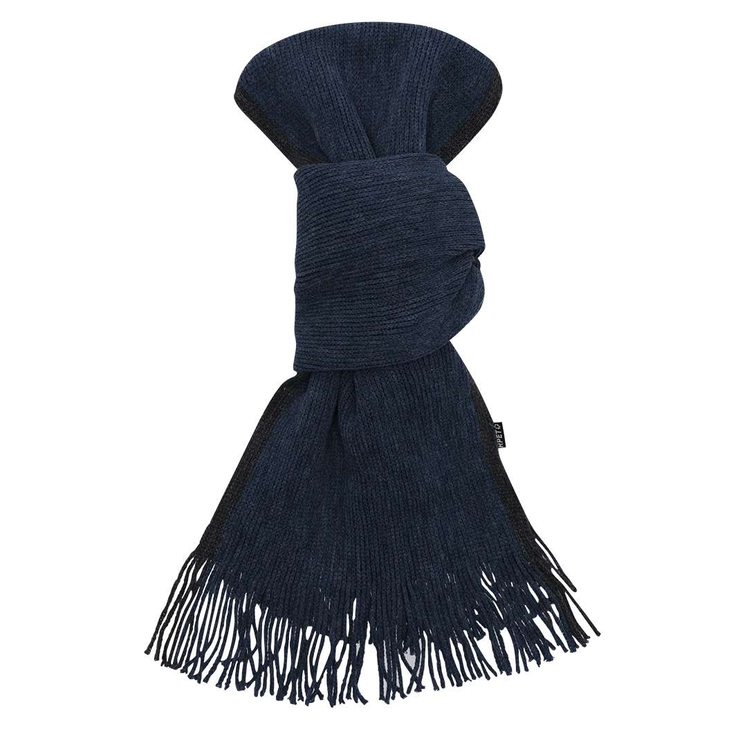 Sciarpa morbida e calda realizzata in caldo poliestere RPET. Realizzata in elegante varietà in bicolore con bordi di colore diverso, finitura sfrangiata. Con logo RPET sull'etichetta. Presentata singolarmente in una scatola nera.Il materiale RPET è realizzato con plastica riciclata, in modo da incentivare il riutilizzo dei rifiuti plastici e aiutare la sostenibilità del pianeta.