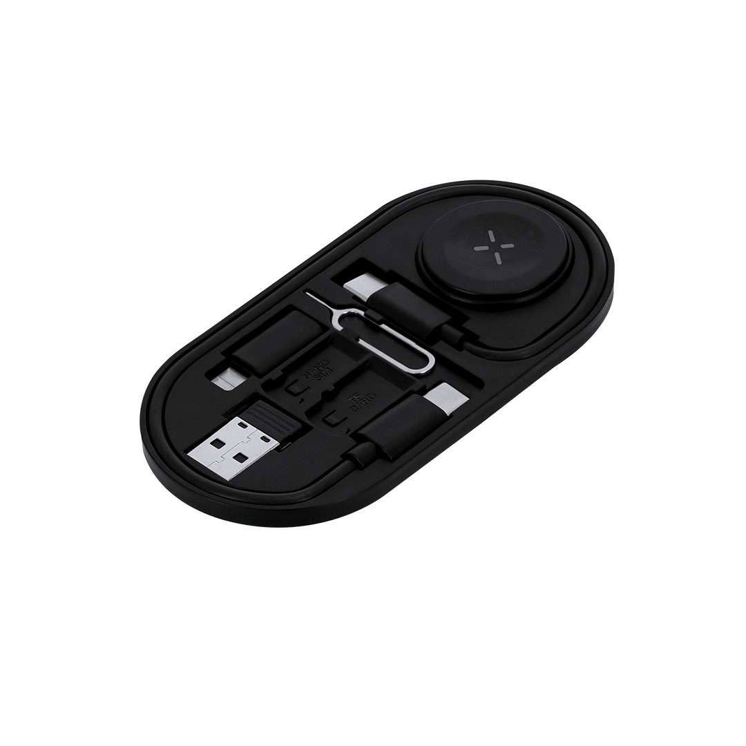 Set di cavi caricabatterie in ABS riciclato (RABS). Include:- Ricarica wireless per smartwatch,- Cavo multifunzione con teste USB, di tipo C e Lightning, compatibile con una vasta gamma di dispositivi e capace di trasferimento dati.- Pin di espulsione SIM, con fessure per lo stoccaggio di Nano SIM e schede TF.Il RABS è una plastica altamente riciclabile di grande resistenza e con molteplici applicazioni che lo rendono una soluzione eco-friendly. Con certificazione RCS, che garantisce l'origine riciclata dello stesso e con logo RABS inciso.