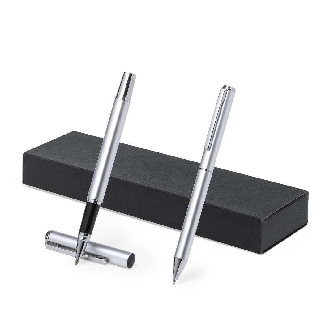 Set di penna e roller in Alluminio Riciclato. Penna con meccanismo a rotazione e penna roller con cappuccio, entrambe dotate di clip in metallo. Entrambe sono dotate di inchiostro blu e fusto con finitura lucida, con logo Recycled Aluminium. Presentate in una scatola kraft individuale. L'Alluminio Riciclato è un materiale con possibilità di riciclaggio quasi infinite, senza perdere le sue proprietà originali e consumando meno energia nel processo.Certificazione GRS (Global Recycled Standard), che garantisce l'origine riciclata del materiale utilizzato per la fabbricazione del prodotto.