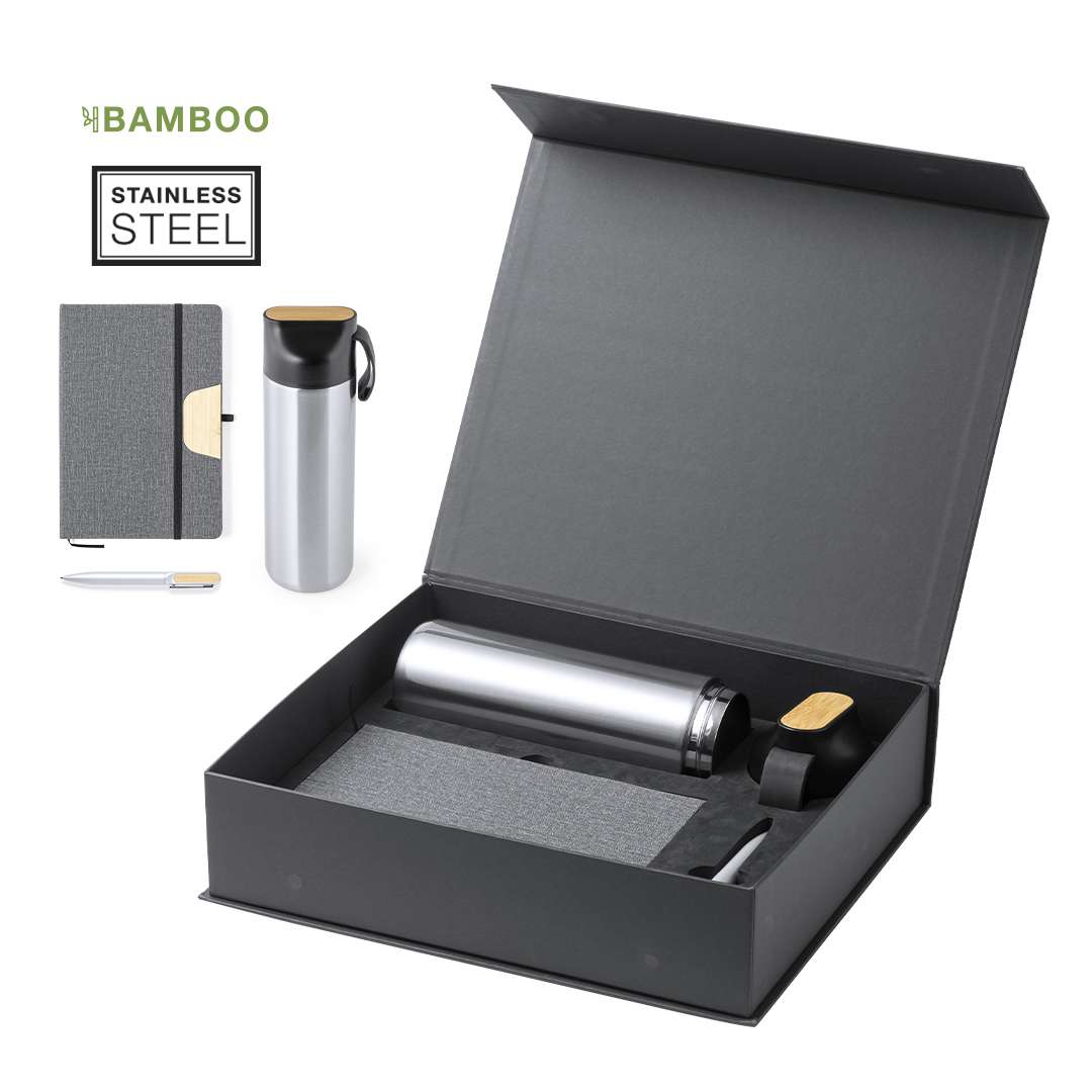 Elegante set premium, che comprende:Tazza thermos a doppia parete in acciaio inox. Capacità di 640 ml, con area in bambù sul coperchio per il branding. Blocco note in morbido PU con porta smartphone integrato sulla copertina e area in bambù per il branding. Include chiusura elastica, segnalibro e portapenne in coordinato. Allinterno 80 fogli di layout a righe. Penna a sfera in alluminio con finitura opaca, area in bambù per il branding, meccanismo a rotazione e inchiostro blu. Presentata in un astuccio individuale con finitura opaca e chiusura magnetica, con fustellatura interna per ciascuno degli elementi del set.