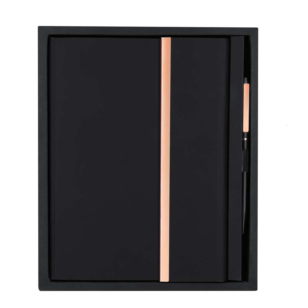 Set di blocco note e penna realizzati in PU riciclato e alluminio riciclato. In elegante nero opaco con accessori distinti in finitura oro rosa.Blocco note con copertina rigida in PU riciclato, chiusura magnetica e dettagli in oro rosa. Con 80 pagine color crema a righe singole, segnalibro coordinato e porta penne interno, oltre al logo in PU riciclato sulla copertina posteriore.Il set è completato da una penna a sfera in alluminio riciclato, nero opaco con dettagli in oro rosa e clip metallica. Meccanismo a torsione e inchiostro blu, con logo in alluminio riciclato.Presentato in un elegante astuccio nero.Il PU riciclato si distingue per la sua resistenza e elasticità. Questo materiale riciclabile è una scelta sostenibile che recupera le fibre scartate nei processi di produzione, riducendo al minimo lo spreco di materiale e contribuendo a ridurre l'impatto ambientale, mantenendo le sue proprietà originali.L'alluminio riciclato è un materiale con possibilità di riciclaggio quasi infinite, che conserva le sue proprietà originali e consuma meno energia nel processo.Certificazione GRS (Global Recycled Standard), garantendo l'origine riciclata del materiale utilizzato per la produzione del prodotto.