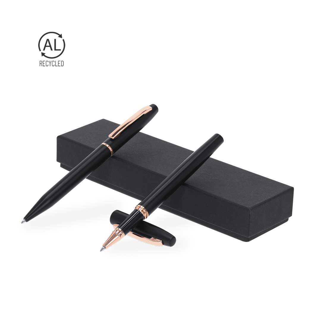 Set di penna a sfera e penna roller in alluminio riciclato, dal design elegante in nero opaco con finiture distintive in oro rosa. Penna a sfera con meccanismo a rotazione e penna roller con cappuccio, entrambe con clip in metallo. Inchiostro blu e logo in alluminio riciclato. Presentato in un elegante astuccio nero.L'alluminio riciclato è un materiale con possibilità di riciclaggio quasi infinite, che conserva le sue proprietà originali e consuma meno energia nel processo.Certificazione GRS (Global Recycled Standard), che garantisce l'origine riciclata del materiale utilizzato per produrre il prodotto.