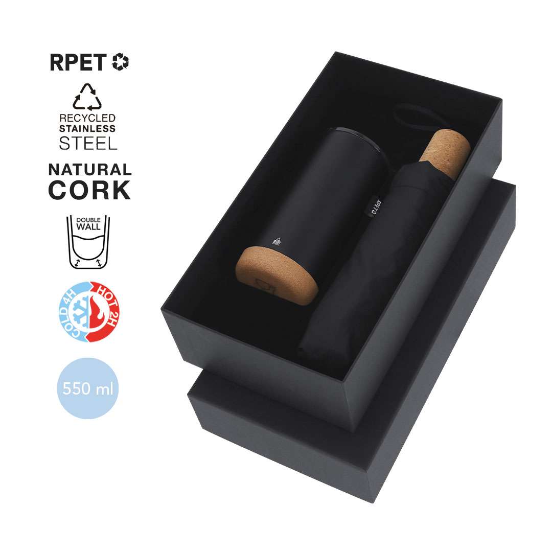 Elegante set premium che comprende: Bicchiere termico a doppia parete in acciaio inox riciclato con capacità di 550 ml ed elegante finitura nera opaca. Base in sughero, con coperchio a pressione e dispenser. È ideale per la tua scrivania, tavolo o qualsiasi superficie dove puoi goderti la tua bevanda preferita. Ombrello nero pieghevole dal diametro di 98 cm. In materiale pongee 190T RPET e manico in sughero. Apertura manuale, con sistema anti-vento e stecche in fibra di vetro. Con marchio distintivo RPET. Set presentato in una scatola individuale con finitura opaca, con fustellatura interna per ogni elemento del set. Il materiale RPET è realizzato con plastica riciclata, per promuovere il riutilizzo dei rifiuti plastici e contribuire alla sostenibilità del pianeta