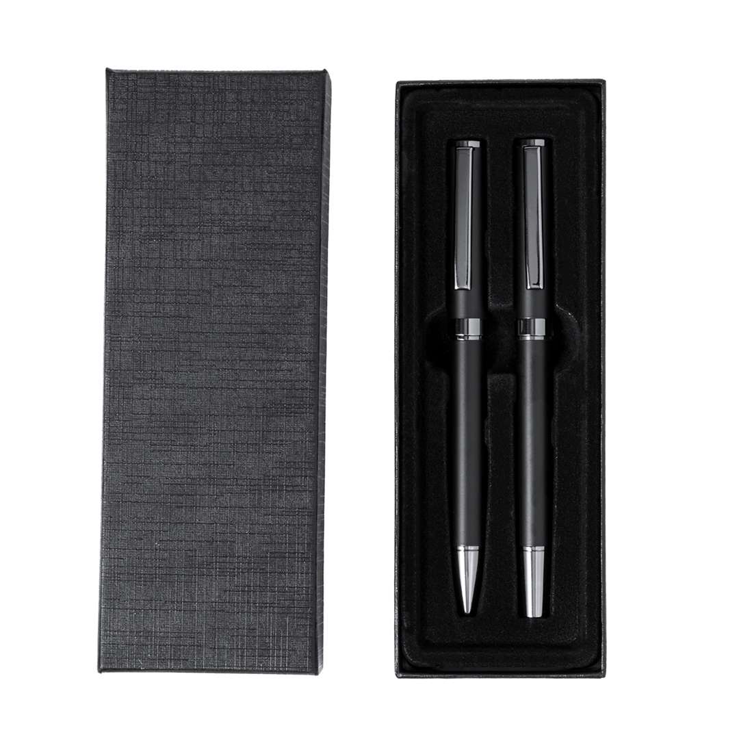 Elegante set di penna e roller. Penna con meccanismo a rotazione e roller con cappuccio, entrambe con clip in metallo. Con inchiostro blu, il fusto ha un'elegante finitura nera opaca e sottili accenti cromati. Presentato in un astuccio kraft nero, con interno fustellato in velluto.