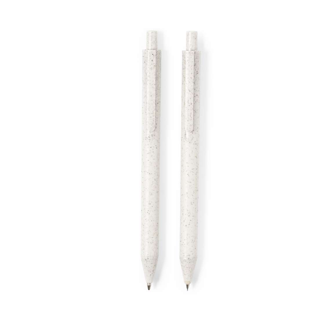 Set di penna e portamine. Realizzato in fibra di grano con clip. Penna a inchiostro blu e portamine con 2 mine da 0,7 mm incluse. Presentati in una scatola individuale di cartone riciclato. Logo Wheat Straw sulla parte superiore della penna e della matita meccanica.La fibra di grano promuove l'uso di materie prime naturali, riducendo così le emissioni inquinanti.
