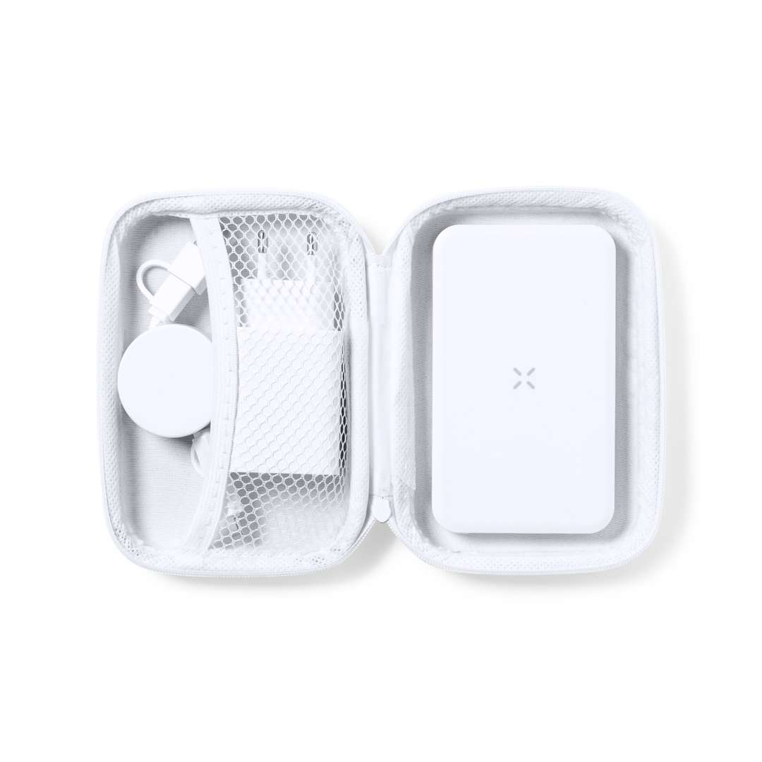 Set di dispositivi di ricarica, realizzati in resistente ABS bianco. Include: Powerbank da 4.000 mAh con caricatore wireless integrato da 5W e compatibile con i dispositivi dotati di tecnologia di ricarica wireless Qi. Con uscita USB, ingresso/uscita USB C e indicatore di stato di carica a LED.Cavo di ricarica e sincronizzazione estensibile, adatto alla ricarica dei dispositivi e al trasferimento dei dati. Include connessioni di ingresso USB e Type-C uscite Lightning, Micro USB e Type-C. 9V DC 2,1A. Caricabatterie da parete a doppia uscita da 220 V: 1 uscita USB QC 3.0 (ricarica rapida) 18W .1 uscita di tipo C 20W, con tecnologia di ricarica rapida PD (Power Delivery), compatibile con una moltitudine di dispositivi.Il set è presentato in una custodia rigida in similpelle, con chiusura a zip e finitura opaca, interni imbottiti e scomparti interni con tasche a rete. Le capacità indicate in tutte le nostre batterie ausiliarie esterne sono reali, e comprendono tutte batterie di grado A e non riciclate, con una vita utile di almeno 500 cicli di carica e conformi alle normative CE. Inoltre, sono prodotti secondo gli standard RoHS e in conformità ai seguenti requisiti di sicurezza:Sistema di protezione da sovraccarico del power bank. Sistema di protezione dalla scarica completa per una maggiore durata del power bank. Sistema di blocco per evitare cortocircuiti. Sistema di trasferimento di carica costante, in base alla capacità del dispositivo di destinazione.