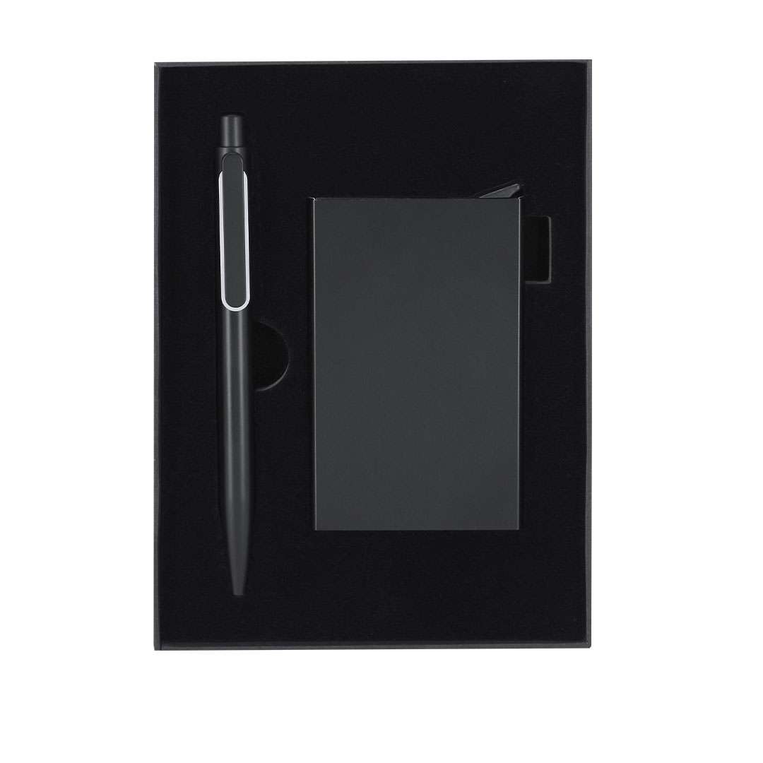 Set di penna e porta biglietti realizzati in Alluminio Riciclato.Il set include:- Penna in nero opaco realizzata in Alluminio Riciclato con meccanismo a pulsante con clip e elemento decorativo in metallo lucido.- Porta biglietti in nero realizzato in Alluminio Riciclato adatto per 6 carte con RFID e meccanismo a pulsante per estrarre le carte.Entrambi con logo di Alluminio Riciclato inciso e presentati in un'elegante scatola nera con interno sagomato.L'Alluminio Riciclato è un materiale con possibilità di riciclo quasi infinite, senza perdere le sue proprietà originali e consumando meno energia in questo processo.Certificazione GRS (Global Recycled Standard / Standard di Riciclo Globale), che garantisce l'origine riciclata del materiale utilizzato per realizzare il prodotto.