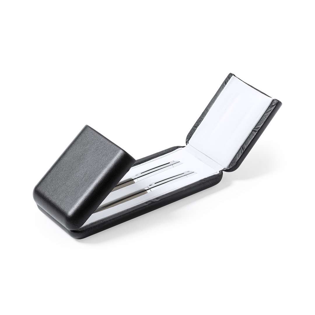 Set di penne a sfera e roller di alta qualità. Realizzato in un'elegante combinazione di metallo nei toni del nero e del cromo. Penna a sfera con meccanismo a rotazione e refill blu, con cartuccia jumbo. Penna roller con cappuccio e refill gel in blu, con cartuccia jumbo. Confezionato in una custodia individuale in similpelle con interno in camoscio bianco a contrasto.