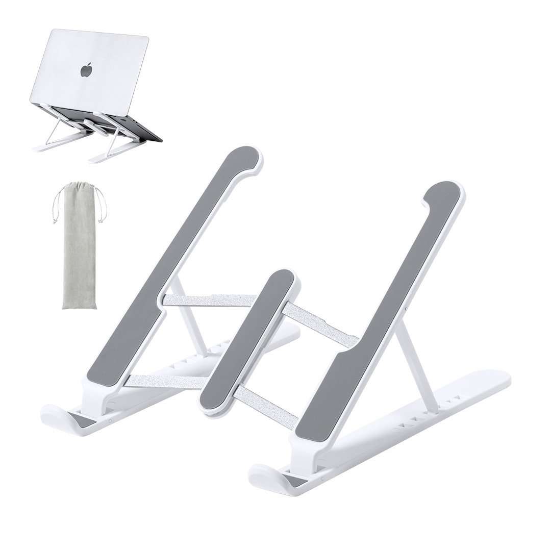 Supporto pieghevole per laptop. Realizzato in resistente ABS con protezione antiscivolo in TPR per un'aderenza salda al dispositivo. Regolabile in altezza, formato pieghevole compatto e confezionato in una custodia in pelle scamosciata con chiusura a coulisse e scatola di design individuale.