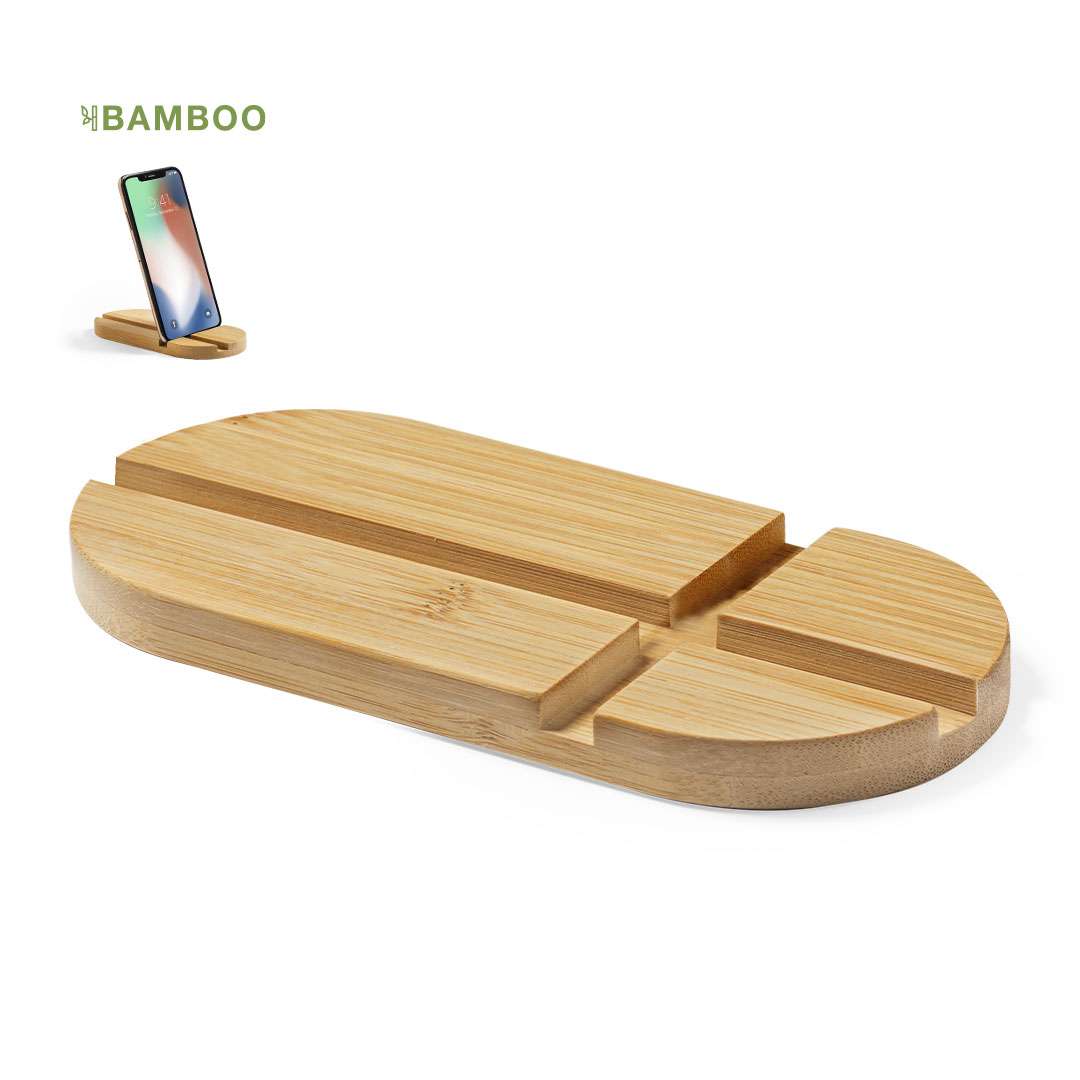 Originale e semplice supporto della linea natura per smartphone e tablet. Fatto di bambù tagliato naturalmente. Confezionato in un'attraente scatola individuale con un design ecologico