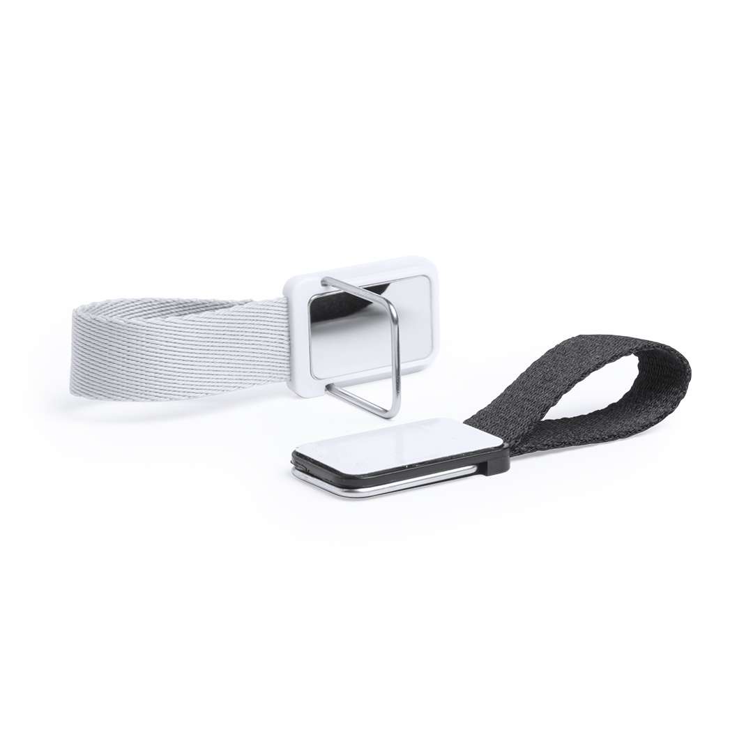 Originale supporto adesivo per smartphone con nastro per selfie in poliestere resistente e cuscinetto per la stampa centrale. Con supporto in metallo e presentato in un'attraente custodia di design.