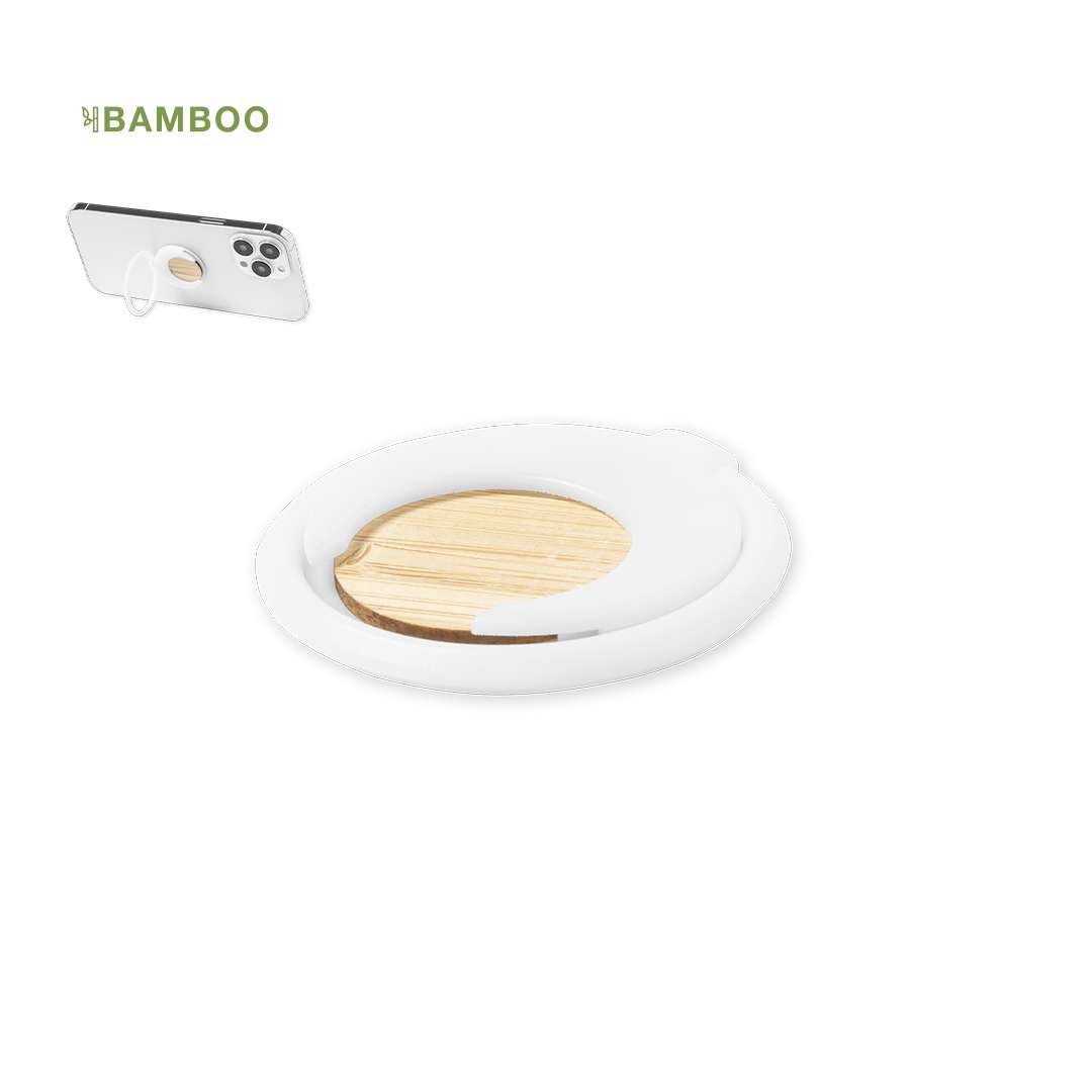 Supporto multifunzione per smartphone con moneta per carrello integrata e anello/supporto pieghevole. Corpo in resistente ABS con finitura bianca e moneta in bambù. Con un'adesione adesiva extra forte e senza residui quando si stacca dal dispositivo.