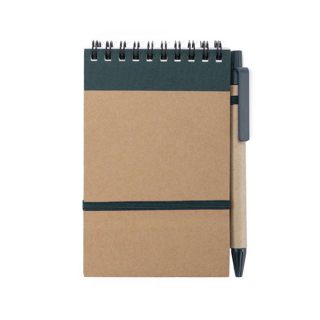 Taccuino ad anelli con copertina soft touch rifinita in resistente cartone riciclato bicolore, rilegatura elastica sulla copertina anteriore e penna in cartone riciclato coordinati. 70 fogli con layout a a righe dai colori vivavi e design ecologico e portapenne sul retro della copertina.