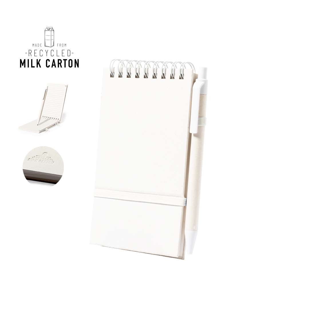 Taccuino dalla copertina rigida realizzato con cartoni del latte riciclati. Con 80 fogli con layout a righe singole, elastico coordinato e portapenne. Include anche una biro coordinata con meccanismo a pulsante e inchiostro blu. Logo Cartone del Latte Riciclato sugli angoli delle pagine, sulla copertina posteriore e sulla penna. Presentato in una busta individuale riciclata.I cartoni del latte sono fatti principalmente di cartone e alluminio. Durante il processo di riciclaggio, i diversi materiali di imballaggio vengono separati per essere riutilizzati e reimpiegati, contribuendo così all'infinito percorso dell'economia circolare. Questo materiale è caratterizzato da un elevato grado di riciclabilità, oltre che da leggerezza e resistenza.