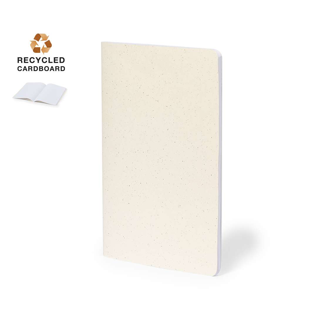 Taccuino con copertina in cartone riciclato e finitura cucita in tinta sul dorso. All'interno 60 pagine lisce e bianche. Presentato in busta individuale riciclata.